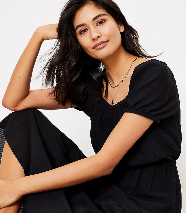 #559762 This midi dress flutters and swirls into romantic territory with a flattering cinched waist and a tiered skirt. Elasticized square neck. Short sleeves with puffed shoulders and elasticized cuffs. Elasticized waist. Lined.